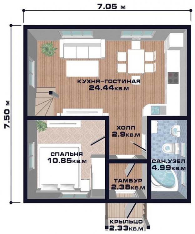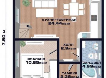 На первом этаже дома располагается просторная кухня-гостиная – многофункциональное помещение для отдыха всей семьей, соединѐнное с просторным холлом. Квадратный в плане тамбур позволяет разместить уличную обувь и верхнюю одежду, а также уменьшает теплопотери дома в холодное время года. Часть первого этажа занимает обширный санузел и уютная спальня, которая может использоваться в качестве детской или комнаты для гостей.