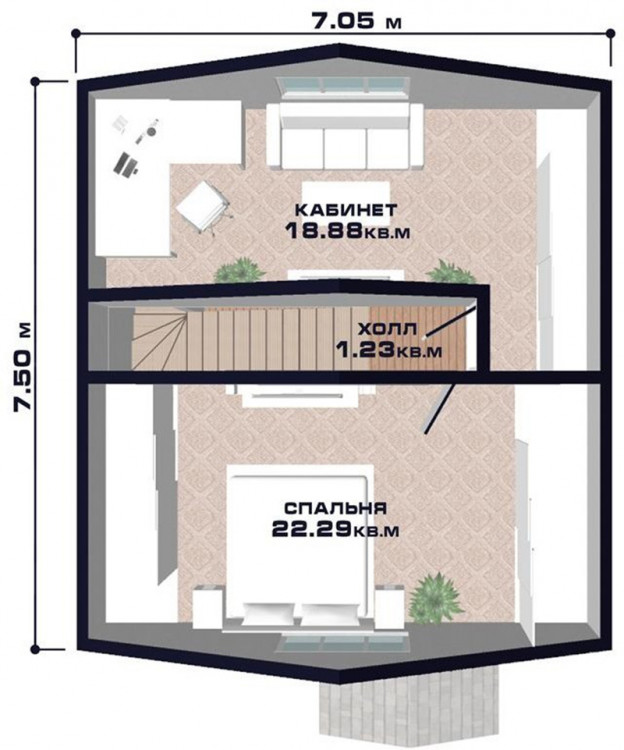 На втором этаже находится прекрасно освещенный рабочий кабинет и просторная спальня. Продуманное деление на рабочую зону и зону отдыха позволит взрослым членам семьи с лѐгкостью организовать свой ежедневный быт.