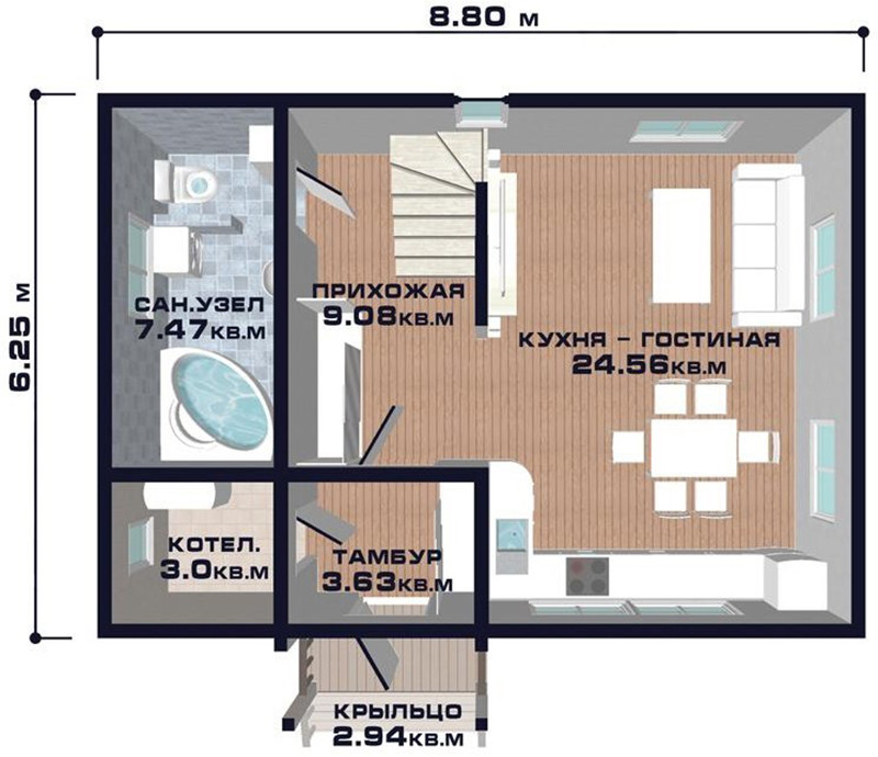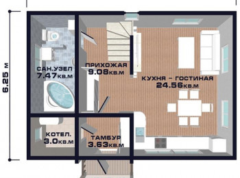 На первом этаже расположена просторная кухня-гостиная, соединѐнная с прихожей, а также небольшой тамбур, бойлерная и совмещенный санузел.