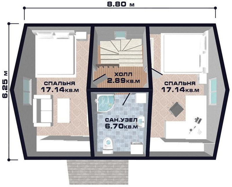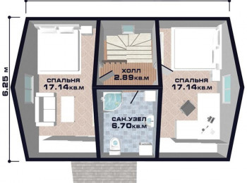 На втором этаже находятся две отдельные спальни, разделенные удобным холлом. В соответствии с европейскими традициями проект сборного дома снабжен вторым санузлом, прилегающим к спальням – подобное решение позволяет сделать домашнюю жизнь большой семьи значительно удобнее.