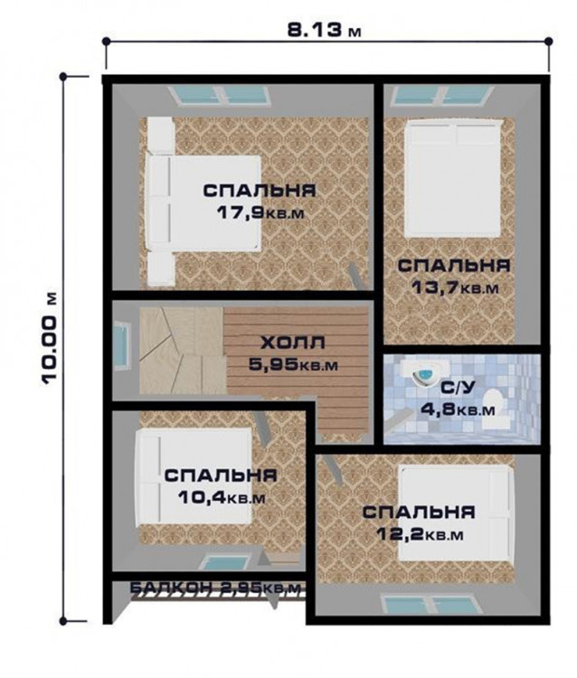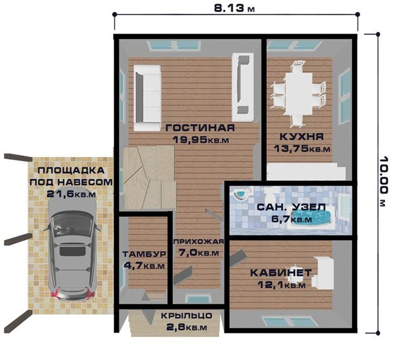 Отказ от устройства подвала, а также холодного чердачного помещения, позволил существенно сократить стоимость проекта и использовать для оформления мансардного этажа значительное пространство. Просторный навес вполне заменит гараж, при том что обойдется куда дешевле.