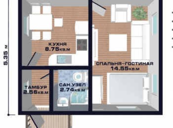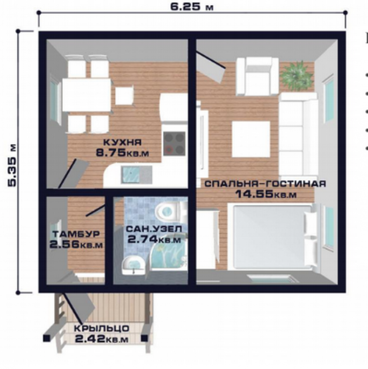 Основную внутреннюю площадь дома занимает просторная комната, совмещающая функции спальни и гостиной. Кухня-столовая даѐт возможность организовать семейный обед или застолье с друзьями. Для хранения верхней одежды и обуви при входе размещѐн тамбур. Совмещѐнный санузел – отличное решение, позволяющее сэкономить пространство и поддерживать высокий уровень комфорта в загородном коттедже. Возведение дома по проекту "Тихвин" под ключ – выбор тех, кто хочет построить дом недорого, не теряя при этом в качестве.